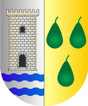 gules, una torre de oro (otros pintan un castillo), aclarado de azur y mazonado