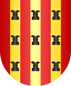 plata, puestas en situación de faja. 5.- Otros traen: En campo de oro, una diligencia, de oro, tirada por seis caballos. 6.- Otros, en Cataluña, tienen: En campo de gules, cinco canales de plata, puestos en sotuer. 7.- Otros traen: En campo de azur, una cruz, de oro, y en punta tres veneras, de plata, puestas en faja. 8.- Estas armas traen los originarios de San Mateo (Barcelona), según Vicente de Cadenas. Los de Reus traen: Escudo partido: 1º, en campo de gules, cinco canales o tejas de plata, puestas en sotuer, y 2º, en campo de azur, un castillo donjonado de oro. 9.- Los de Cataluña, según Juan del Corral, traen: En campo de gules, una faja de oro, y una orla llana también de oro. Complemento de información de estos linajes por cortesía de blasonari.net |