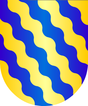 gules, con dos calderas de sable, y, en cada uno de sus cuatro ángulos,
