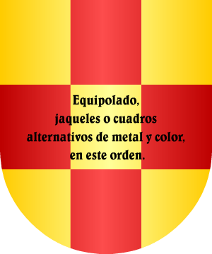 Los colores del campo del escudo en la heráldica española están limitados a cinco; gules (rojo), azur (azul), sinople (verde) sable (negro), y púrpura (morado). Este último tiene también la doble "propiedad" de color como de metal. Se añaden los esmaltes de oro (amarillo) y plata (gris claro o blanco), como metales.