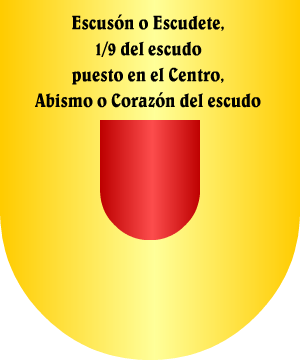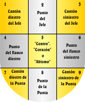El escudo se subdivide en 9 puntos principales; 1.- Cantón diestro del Jefe, 2.- Punto (central) del Jefe, 3.- Cantón siniestro del Jefe, 4.- Punto del flanco diestro, 5.- Centro, Corazón o Abismo, 6.- Punto del flanco siniestro, 7.- Cantón diestro de la punta, 8.- Punto (central) de la Punta y 9.- Punto siniestro de la punta.