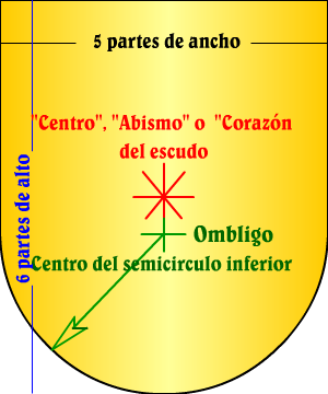 La forma básica del escudo en la heráldica española es un rectángulo de 5 partes de ancho por 6 de alto, cualesquiera que sean sus dimensiones. La parte inferior en semicírculo o arco de medio punto invertido. A notar que el centro de este semicírculo no es el centro del también llamado "Abismo", "Corazón" o verdadero "Centro" del escudo. Al centro del semicírculo se le denomina "Ombligo".