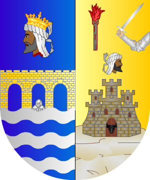 2.- Sus primitivas armas, que son las de Andrés: En campo de azur, un puente de tres arcos de oro, sobre un río, y bajo su arcada central, tres rocas de plata; en el jefe, una cabeza de rey moro chorreando sangre.