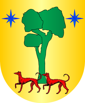 6.- Otros traen: En campo de azur, una banda de oro, acostada de cuatro estrellas de lo mismo, dos en jefe y dos en punta.