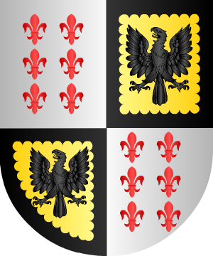 3.- Algunos autores señalan las siguientes: En campo de plata, una banda de gules, acompañada en lo alto de una cruz flordelisada de sable, y en lo bajo de un águila, también de sable, coronada de lo mismo.