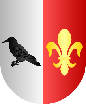 una banda de gules, acompañada en lo alto de una cruz hueca y flordelisada