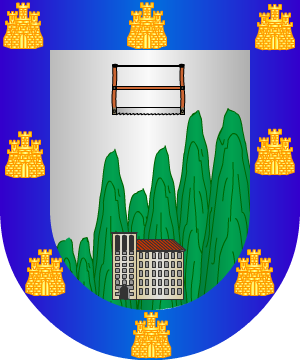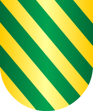 de sinople, puestas en sotuer; 2º y 3º, de gules, con un castillo
