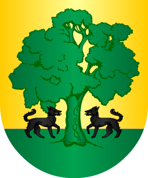 de cuatro lobos andantes de sable, linguados y vilenados de gules, uno en cada