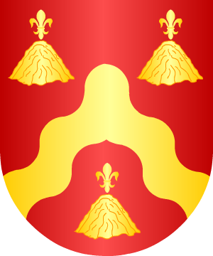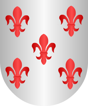 una banda de gules, acompañada en lo alto de una cruz hueca y flordelisada