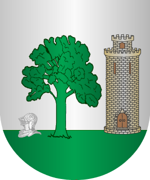 29.- Otros Cabanellas: En campo de sinople, una encina, de oro, frutada de gules, y alzado a su copa, un lobo, de sable, linguado de gules.