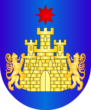 58.- Los de Daroca y Villarreal de Huerva (Zaragoza) traen: En campo de azur, un castillo de oro sostenido por dos leones del mismo metal, surmontado por una estrella de gules en la torre del homenaje.