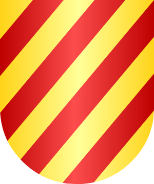 20.- Otra rama de Valencia trae: En campo de plata, un castillo de gules, y brochante sobre el todo una banda de sable. Bordura de sinople, con ocho bezantes de oro.