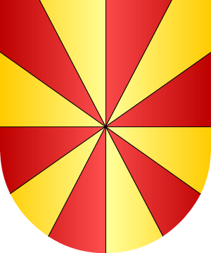 18.- Los Barones de Albi usan: Escudo partido: 1º, en campo de oro, un árbol sobre un promontorio, de sinople, y 2º, en campo de oro, dos palos, de gules.