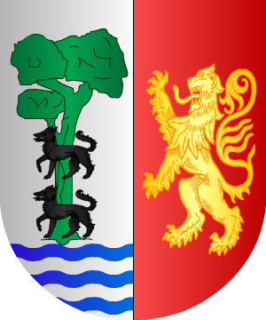 14.- Otros del Poyo, traen: Escudo partido: 1º, en campo de plata, un pino de sinople terrasado, y dos leones empinados a su tronco; 2º, en campo de gules, un león rampante.