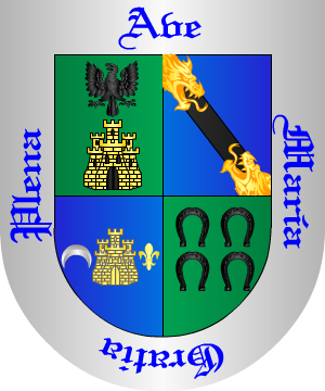 11.- La casa de Villajimena (Palencia) usan: Escudo cuartelado: 1º, en campo de sinople, un castillo de oro sumado de un águila de sable; 2º, en campo de azur, un tronco nudoso de sinople, puesto en situación de banda, y engolado en bocas de dragones de oro; 3º, en campo de azur, una banda de oro, acompañada en lo alto, de una flor de lis del mismo metal, y en lo bajo, de un creciente de plata ranversado, y 4º, en campo de sinople, cuatro herraduras de plata, puestas dos y dos. Bordura de oro, y en letras de azur el lema "Ave María Gratia Plena".