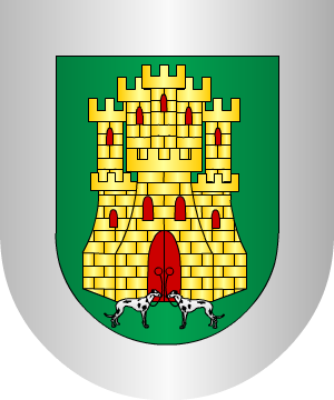 2.- Otros traen: De sinople, un castillo de oro de cinco torreones aclarados de gules, con dos lebreles de plata manchados de sable, atados a las aldabas de su puerta y afrontados. Bordura de plata plena.