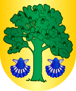 En campo de oro, un roble de sinople, acompañado de dos veneras de azur, realzadas de plata, una a cada lado del tronco.