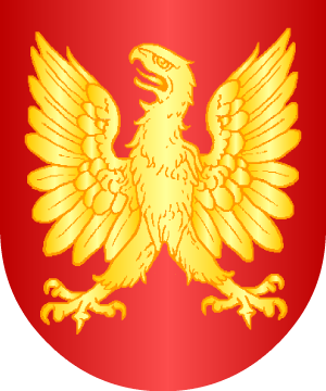 Logroño. Cuartelado por una cruz de San Juan de oro: 1.º, en sinople, dos castillos, de plata, sumado cada uno de sus homenajes de una bandera, de plata, con una cruz de gules; 2.º, en azur, dos medias lunas, de plata, adiestradas y rodeadas de trece estrellas de oro; 3.º, en plata, un león de gules, rampante y coronado, de oro, y 4.º, jaquelado de oro y gules. (Ref.: CADENAS) |