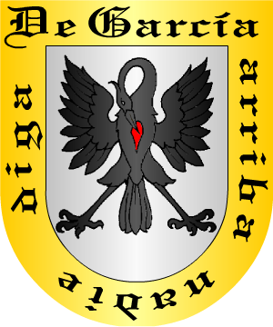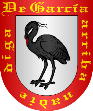 Apellido patronímico, derivado del nombre propio de Garci o García. En el idioma godo, significaba "Príncipe de vista agraciada". Se ha presentado la duda si el apellido García tuvo su origen en Euskalerría. Menéndez Pidal dice: "El nombre vasco García es ya citado en los años 789 y 791 en Castilla. La reina Jimena de León, antes princesa navarra, lo introdujo en Castilla. Uno de sus hijos se llamó García, nombre introducido en Occidente por influencia navarra. Ante la invasión árabe, muchas familias de Castilla, Aragón y Vasconia, huyeron. Tan grande fue la desbandada y tan confusa que se llegó a perder el contacto familiar y los niños olvidaron hasta su nombre. Motivo por el que gran cantidad de ellos eligieron el de García, lo que hizo popular el dicho: "Quien nombre no tenía, García se ponía". Lo anterior se refiere al nombre. ¿Y el apellido? ¿Efectivamente es vasco? García procede de Hortza, Artza, Baartze o Hartze, Es oriundo de Iparralde, lugar donde se aspira la "h", es un sonido parecido a la "g", por esto se aplicó dicha letra por los amanuenses y como no sabían pronunciar la "tz" sufrió muchas variaciones en su escritura. Muchos de los caballeros que lo ostentaron desde remotos tiempos tuvieron la dignidad de Ricohombres. Uno de los primeros varones apellidados García, de que se tiene noticia, fue Ramiro García, Potestad y Gobernador por los años 843. En 981 florecieron Nuño García y Fortún García, este último Señor de la Torre de Tovar; Sancho García fue Conde de Castilla en el siglo X. Varias familias de este apellido proceden de Garci-Jiménez, el héroe de la reconquista de Aragón, que ganó Ainsa, donde fortificó tomando el nombre de Rey de Sobrarbe. Muchas de las numerosas casas del apellido García no tuvieron igual origen ni proceden de un mismo primitivo solar y tronco. Por el contrario, son tan varias y dispares sus procedencias que no existe entre la mayoría de ellas ningún vínculo de parentesco, ni la mas leve y primitiva comunidad de sangre pues, la coincidencia de apellidarse de igual modo, queda plenamente explicada con la antigua y generalizada costumbre de convertir en apellido patronímico el nombre propio de un antecesor. El apellido García está muy extendido por la Península y América. En la actualidad en el apellido de mayor difusión en España. Un 3,65% de los españoles tienen este apellido. Su distribución alcanza a todas las actuales comunidades, siendo el más difundido en 11 de las 17 existentes: Castilla y León (5,33%), Madrid (4,21%), País Vasco (2,67%), Navarra (2,10%), Aragón (2,44%), Andalucía (3,69%), Extremadura (3,33%), Castilla la Mancha (4,61%), Cataluña (2,84%), Comunidad Valenciana (3,44%), y Baleares (2,21%). En otras tres ocupa el segundo lugar: Rioja (3,3%), tras el apellido Martínez (4,2%), Murcia (5,32%), también tras el apellido Martínez (6,54%) y Asturias (3,59%), tras el apellido Fernández (7,92%). En Cantabria (3,59%) es el tercero tras Fernández (4,13%%) y González (3,67%) y, dinalmente, en Canarias (3,54%) y Galicia (2,89%) ocupa el quinto lugar tras Rodríguez (4,88%), González (4,76%), Hernández (4,24%) y Pérez (3,76%), y Fernández (4,07%), Rodríguez (3,68%), González (3,28%) y López (2,94%), respectivamente. Armas (1 al 50) 1.- En Asturias, usaron los García más antiguos estas armas: En campo de plata, una garza de plata picandose el pecho, en el que muestra una herida. Bordura de gules, con este lema en letras de oro: "De García arriba nadie diga". (Ref.: MOGROBEJO). 2.- Otros pintan esta bordura de oro y las letras de sable. D'argent, à un héron de sable dans l'attitude de l'aigle héraldique, s'ouvrant du bec la poitrine ensanglantée, à la bordure d'or, chargé des mots DE GARCIA ARRIBA NADIE DIGA, en lettres de sable. (Ref.: RIETSTAP), (ref.: MOGROBEJO). 3.- Los de Galicia, Asturias y Burgos traen: En campo de plata, una garza de sable, con el pecho rajado; bordura de gules, con este lema: "De García arriba nadie diga", en letras de oro. (Ref.: ATIENZA), (ref.: GONZALEZ-DORIA), (ref.: GARCIA CARRAFA), (ref.: CADENAS), (Ref.: CRESPO DEL POZO). 4.- Una rama de Andalucía trae: En campo de plata, una garza de sable, con el pecho rajado; bordura de azur, con ocho aspas de oro. (Ref.: ATIENZA), (ref.: GONZALEZ-DORIA), (ref.: GARCIA CARRAFA), (ref.: CADENAS), (Ref.: CRESPO DEL POZO). 5.- Los del concejo de Carreño, los de la villa de Candás y los de la parroquia de Guimarán de Moncalvillo (Burgos) traen: Escudo cuartelado, 1º de oro, una garza de sable picándose el pecho y un globo terráqueo de azur a su lado; 2º de plata, un castillo de gules, cargada la torre central con un ángel con dos alas al natural, y a la puerta del castillo, un hombre armado con espada y rodela; 3º de plata, cinco cabezas de moro con sus turbantes puestas en sotuer; y 4º de gules, una espada desnuda de plata puestas en faja, acompañada de tres morriones o celadas de acero con viseras y plumaje, dos en lo alto y una en lo bajo. Bordura de plata con veinticuatro escudetes de sable. (Ref.: ATIENZA), (ref.: GONZALEZ-DORIA), (ref.: GARCIA CARRAFA), (ref.: CADENAS). 6.- Otros de Burgos y Asturias traen: Escudo cuartelado, 1º y 4º de gules, una mano apalmada de hombre, y en punta ondas de mar de azur y plata; y 2º y 3º de azur, un lucero de ocho rayos de oro. (Ref.: ATIENZA), (ref.: GONZALEZ-DORIA), (ref.: GARCIA CARRAFA), (ref.: CADENAS), (ref.: MOGROBEJO). (este último autor indica que las manos son de plata). 7.- Los del concejo de Corvera (Asturias) traen: En campo de sinople, dos leones rampantes y afrontados al natural; en jefe dos flores de lis, una de plata y otra de azur, retocada de plata. (Ref.: ATIENZA), (ref.: GONZALEZ-DORIA), (ref.: CADENAS). 8.- Los de la parroquia de Soto y villas de Cangas de Onís y Llanes: Escudo cortado: 1º, de plata, con tres pinos de sinople, bien ordenados, y 2º, de azur, con un león rampante de plata. (Ref.: GARCIA CARRAFA). 9.
