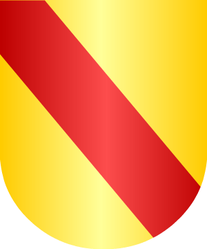 Écartelé en sautoir: au 1, bandé d'or et de gueules; au 2, d'or, à un badelaire au naturel, en pal, la pointe en bas, adextré des mots AVE MARIA, d'azur, en orle; au 3, d'or, à un badelaire pareil, la pointe en bas, senestré des mots GRATIA PLENA, d'azur, en orle; au 4, bandé de gueules et d'or, à une tête de More, posée de front, tortillée d'argent, brochant sur ledit bandé. Supports: deux lions regardants, au naturel. (Ref.: RIETSTAP). |