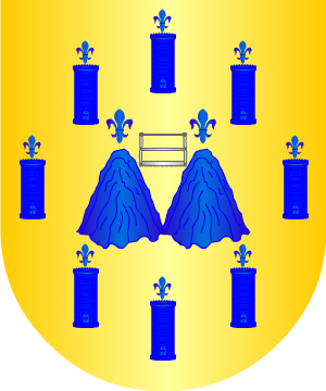 8.- Otros de Cervera usan: En campo de azur, un monte de dos puntas, de oro, sumado de una sierra de lo mismo, cerrado de una palizada de plata y ocho flores de lis de lo mismo puestas en orla.