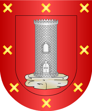 De gules, una torre de plata sobre unas peñas. Bordura de gules con ochos aspas de oro.