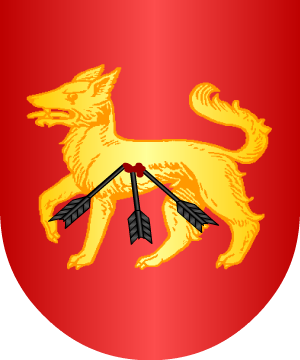 10.- Los de Perú, según Cadenas, traen: En campo de gules, un lobo andante, de oro, con tres saetas, de sable, hiriéndole en el costado.