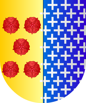 10.- Otros Prat, en Cataluña, traen: Escudo partido: 1º, en campo de oro, cinco rosas de gules, puestas en sotuer, y 2º, en campo de azur, sembrado de crucecitas llanas, de plata.