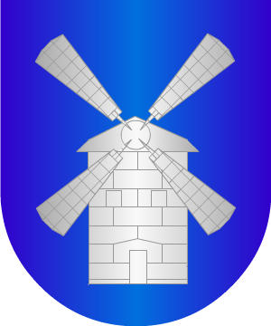 1.- En campo de gules, un castillo de piedra, sobre ondas de agua de azur y plata, acompañado de dos cabezas de sierpe, de oro, una a cada lado: cortado de sinople, con un puente sobre agua, sumado de dos torres, una almenada, con una bandera de plata, en las almenas, cargada de una cruz de gules, la otra torre, sin almenas y con una escalera apoyada en sus muros.