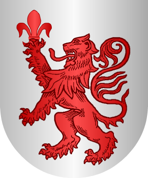 7.- Otros traen: Escudo partido: 1º, de plata, una cruz hueca floreteada, de gules, acompañada de cuatro roeles de lo mismo; y 2º, de sinople, un castillo, de oro, sumado de un jabalí del mismo metal, y una escalera, también de oro, apoyada en el muro del costado izquierdo del castillo.
