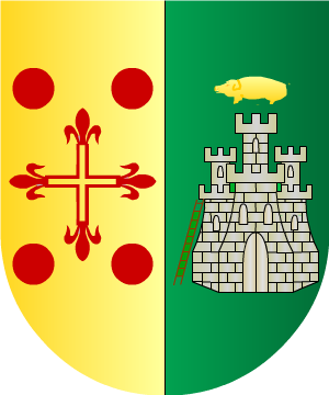 8.- Otros traen: Escudo partido: 1º, de oro, una cruz hueca floreteada de gules, acompañada de cuatro roeles de lo mismo; y 2º, de sinople, un castillo, de piedra, con una escala arrimada a sus muros, y sumado a su homenaje un puerco de oro.