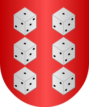 6.- Otros traen: En campo de oro, dos lobos, de sable, andantes y lampasados de gules; en los ángulos altos del escudo, un arpón, acerado, de azur.