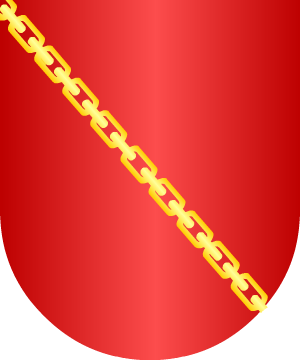 4.- En plata tres gatos pasantes en faja y puestos en palo de purpura; filiera de azur con una cadena de once eslabones enlazados de oro