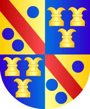 53.- Otros: Escudo cuartelado: 1º, en campo de plata, una barra, de azur, acompañada de dos flores de lis del mismo color; 2º, fajado de azur y oro en cuatro órdenes; 3º, en campo de gules, un brazo armado saliente del flanco siniestro, y en la mano una bandera, de plata, cargada de una cruz, y 4º, en campo de plata, tres flores de lis, de azur.