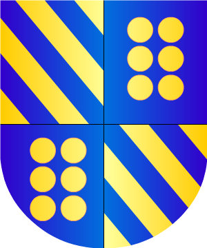12.- Otros, según Diego Hernández de Mendoza, traen: Escudo cuartelado: 1º y 4º, en campo de oro, tres bandas de gules, y 2º y 3º, en campo de gules, seis roeles de oro.