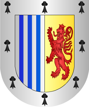 17.- Otros de la casa de la villa de Anzoula, según Miguel de Salazar y Juan Carlos de Guerra, traen: Escudo partido: 1º, en campo de oro, tres bandas de azur, y 2º, en campo de plata, un león rampante de gules; bordura general de plata, con ocho armiños de sable.