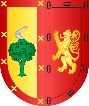Aedo, pero sin las panelas. 12.- Diego de Soto y Aguilar señala para la casa del valle de Carranza: En campo de oro, dos calderas de sable, barradas de plata. 13.- Otros traen: En oro, una cruz llana, de gules, cargada de cinco panelas, de oro. 14.- Otros: En campo de plata, un bastón, de gules. 15.- Los radicados en California (Estados Unidos) y Canadá, según Vicente de Cadenas: En campo de oro, sembrado de corazones, de gules. 16.- Otros, según Juan Carlos de Guerra: En campo de azur, un grifo rampante de oro. 17.- Un caballero del solar del lugar de Aedo, que por enlace con una hembra de la casa de Velasco fue a parar al valle de Mena, adoptó por armas, según el testimonio de Miguel de Salazar y Juan de Mendoza, las siguientes: En sinople, una torre de oro, aclarada de gules. 18.- Otros Haedo: En campo de plata, dos panelas, de gules, puestas en palo y acompañadas en su diestra, de una torre, de su color. 19.- Los de Valmaseda, y sus ramas en Bilbao y San Sebastián, según Vicente de Cadenas, traen: En campo de sinople, tres fajas, ondeadas, de azur y plata. 20.- Los del valle de Carranza, según Francisco Piferrer, traen: En campo de oro, un árbol terrasado y copado, con un lebrel atado al tronco, azorado por una serpiente, puesta en la copa del árbol, en ademan amenazador. 21.- En los lugares de Ahedo, Manzaneda de la Sierra y San Esteban, todos pertenecientes al valle de Carranza, constan estas armas para los Ahedo: Un árbol arrancado, con dos lobos pasantes al pie del tronco, puestos en palo. 22.- Los de Valmaseda, según Jorge de Montemayor, traen: En campo de oro, un árbol de sinople, y dos perros andantes, manchados, y encima del árbol, una sierpe de su color. 23.- En la casa de Ahedo Gómez, del lugar de Bollaín, en el valle de Carranza, constan las siguientes armas para los Ahedo: Un árbol, con un lobo pasante y atado al mismo. 24.- En Rasines (Cantabria) consta este otro escudo: Escudo partido: 1º, un árbol arrancado con dos lobos pasantes al tronco, y 2º, un perro o lobo atado a un árbol, y en jefe una sierpe. Al lado derecho del árbol una flor de lis, y al izquierdo un castillo. 25.- Diego de Ahedo y Ochoa, Arzobispo de Palermo, usaba por armas: Escudo partido: 1º, un árbol con dos lobos pasantes, uno sobre el otro, y 2º, cortado: primero, una cruz de Calatrava, y segundo, un castillo (Armas de los apellidos Ahedo y Ochoa). 26.- En las Encartaciones hubo Aedo que usaron este escudo partido: 1º, en campo de azur, un árbol de su color y un lebrel de plata atado a su tronco, y 2º, en campo de oro, una cadena de sable de ocho eslabones y una flor de lis del mismo color en el cantón siniestro de la punta. 27.- Otros en las Encartaciones hubo Aedo que usaron este escudo partido: 1º, en campo de azur, un árbol de su color y un lebrel de plata atado a su tronco, y 2º, en campo de oro, una cadena de sable de ocho eslabones y una flor de lis del mismo color en el cantón siniestro del jefe. 28.- Los de las Encartaciones de Vizcaya, según Juan Baños de Velasco, y los de Vizcaya, según Miguel de Salazar, traen: En campo de oro, un árbol de sinople, y al pie de él un perro de sable, atado con traílla de azur. Complemento de información de estos linajes por cortesía de blasonari.net |