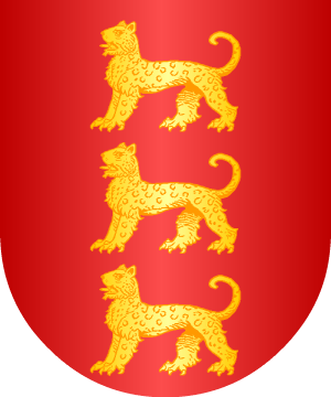 una banda de gules, acompañada en lo alto de una cruz hueca y flordelisada