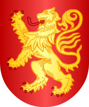 en campo de azur, una banda de oro, con dos flores de lis opuestas de color