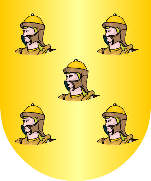 calderas de sable. 12.- Don Felipe II concedió al Capitán Diego Caro, conquistador de Indias, estas otras armas: En campo de azur, un castillo de oro, cercado de una muralla de plata, puesto en aguas de azur y plata y acostado de dos leones rampantes de oro, surmontados de dos águilas mitad de sable mitad de oro y con las patas también de oro. De la torre de homenaje del castillo sale un brazo armado, de plata, sosteniendo una bandera de sinople con el asta y lanza de oro y cargada de una estrella de este jefe, de oro, partido de lo mismo: en su primera partición un escudete de azur con dos mesas o tablas de oro, cargadas cada una de tres panelas de sable, y bordura de oro, con tres espadas desnudas de plata con la guarnición de sable, y en la segunda partición otro escudete de plata, con una cruz floreteada de sable, y bordura cosida de plata, con ocho calderas de sable. Bordura general de gules, con diez hachas de plata con el mango de oro. (Reproducimos únicamente el escudo mencionado más abajo) 12.- Las armas que contiene el segundo escudete del jefe son las mismas que tomaron los caballeros Caro que asistieron a la batalla de las Navas de Tolosa. Información de estos linajes complementada por cortesía de blasonari.net |
