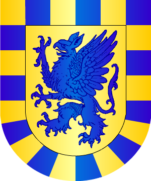 en sus Trovas, traen: En campo de plata, seis roeles de azur, puestos dos, dos