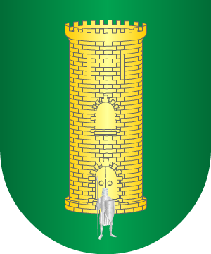 de azur, acompañada de dos cruces huecas, de gules, una arriba y otra