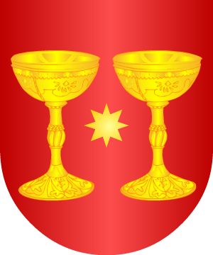 oro. 6.- En la calle Cadenas, de Arcos de la Frontera (Cádiz), traen: En campo de gules, dos cálices de plata, puestos en palo, boca con boca, con cinco estrellas de plata, puestas en sotuer, y la del centro entre las bocas de los cálices. 7.- Otros de Arcos de la Frontera usan: En campo de gules, dos cálices de plata, puestos en palo, boca con boca, acompañado de cinco estrellas de oro, puestas en sotuer, y la del centro entre las bocas de los cálices, y, en punta ondas de azur y plata. 8.- Ferrant García de Cuenca, Cofrade de Santiago de Burgos, usaba: En campo de plata, cinco castillos de azur, puestos en sotuer. Bordura de azur con veneras de oro. 9.- Los radicados en Almansa (Albacete), según Vicente de Cadenas, traen: En campo de oro, dos escudetes, de azur, puestos en palo. 10.- Otros: En campo de plata, un escusón, de gules, cargado de un lunel, de plata. 11.- Los de Génova pintan: En campo de gules, dos copas de plata, puestas en situación de faja y sumada cada una de una estrella de oro. 12.- Miguel de Salazar dice que también hubo familias del apellido Cuenca que usaron el siguiente escudo: De azur, con cinco veneras de plata, puestas en sotuer. 13.- Miguel de Salazar dice que también hubo familias del apellido Cuenca que usaron el siguiente escudo: De oro, con un águila de sable coronada del mismo color y acostada, a la diestra, de una K, y a la siniestra, de una E, también de sable. 14.- Algunos de este linaje usaron las armas de la ciudad de Cuenca, que son: En campo de gules, un cáliz de oro, sumado de una estrella de plata de ocho puntas. 15.- Alfonso García de Cuenca, Cofrade de Santiago de Burgos, usaba: Escudo cuartelado: 1º y 4º, en campo de azur, ... (borrado), y 2º y 3º, en campo de oro, tres barras de azur. 16.- Los de Lorca usan: "quatro quarteles, en los dos altos un castillo de oro en campo roxo, en el de la derecha, y en el de la izquierda un pino de su color en campo azul, y en el angulo superior derecho la Venera de la Santa Inquisición, atravesando ambos quarteles, desde el angulo inferior de el derecho hasta el superior izquierdo de el siniestro, una vanda roja, que termina en las bocas de dos dragantes. En los dos baxos, en el derecho en campo de oro un brazo arremangado, y es el izquierdo teniendo baxo del nudo una custodia, y de baxo del pie tres alfaxes; en el izquierdo en campo amarillo, un pino con piñas de oro, y a su tronco arrimado un toro. Formase el dicho escudo en la cruz roxa del Avito de Santiago. Por orla una vanda roxa, en la derecha cinco aspas, y en la izquierda cinco armiños, y a cada lado del escudo un leon rampante, puestas las manos sobre la parte superior de dicho Escudo". Complemento de información de estos linajes por cortesía de blasonari.net |
