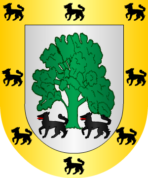 oro. Estas mismas armas usaban los de Ubeda. 13.- Otros traen: Escudo mantelado: 1º, en campo de azur, tres flores de lis de oro, bien ordenadas; 2º, en campo de oro, dos palos de gules, y 3º, o mantel, de plata con una boca de cueva, saliendo de ella un dragón fiero de sinople echando llamas por la boca, y medio salido, sin la bordura. 14.- Los de Ubeda, según Bernardo de Estrada y Nava, traen: Escudo mantelado: 1º, en campo de azur, tres flores de lis de oro, mal ordenadas; 2º, en campo de oro, cuatro bastones de gules, y 3º, en campo de sinople, un dragón de oro saliendo de una cueva oscura. 15.- Los de Alcorisa (Teruel) usan: Escudo mantelado: 1º y 2º, en campo de oro, dos palos de gules, y 3º, o manteladura, de azur, un dragón de oro, linguado de gules. Bordura de gules con ocho sotueres de oro. 16.- Los Duques de Alburquerque usan: En campo de plata, y en el medio de él una lisonja de gules cargada de un castillo de oro; y en los cuatro ángulos, leones rampantes de púrpura. 17.- Otros usan: En campo de plata, y en el medio de él una lisonja de gules cargada de un castillo de oro; y en los cuatro ángulos, leones rampantes de gules. 18.- En la casa llamada del Patriarca, calle del campo o Sopuente, de la villa de Selaya, del valle de Carriedo (Cantabria), constan: Escudo mantelado: 1º, tres flores de lis, mal ordenadas; 2º, tres palos, y 3º, o manteladura, una cueva y un dragón que saca la cabeza por ella. 19.- En la calle de la Carrera, de Santillana del Mar, constan: Tres palos que apoyan en una ojiva o boca de cueva por la que asoma un dragón. 20.- En la torre llamada de Beltrán de la Cueva, del lugar de Queveda, del municipio de Santillana del Mar (Cantabria), constan: Un guerrero montado en su corcel, que introduce su lanza en la boca de un dragón, todo sobre ondas de agua, con una inscripción que dice "Cueva". 21.- A pedimento de Toribio Pérez de Bustamante, que era Señor de la Casa de Cueva en Queveda en 1649, se certifican las armas de esta casa por Juan Francisco de Hita, de esta forma: En campo de azur, una torre de oro, orpasada de gules sobre un risco al natural, y al pie de ella una gruta y a su puerta tres cabezas de moros con turbantes de plata y gules. 22.- Don Enrique IV de Castilla concedió a Beltrán de la Cueva, primer Duque de Alburquerque, primer Conde de Ledesma y de Huelma, las siguientes armas: Escudo cortado bajado: 1º, en campo de oro, cuatro palos, de gules, y 2º, en campo de sinople, una cueva, de sable, de la que sale un dragón, de oro, lampasado de gules. 23.- Otros añadieron una bordura de gules con ocho sotueres de oro. Complemento de información de estos linajes por cortesía de blasonari.net |
