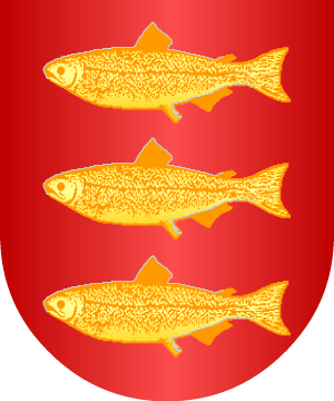 12.- Los Dexprat, radicados en San Esteban de Bas, traen: En campo de sinople, dos torres, de oro, puestas en faja, sobre ondas de azur y plata, y éstas sobre terrasa de sinople.
