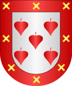 y acompañada de dos gallos de su color, uno en lo alto y otro en lo bajo. 2.- Los de Calamocha (Teruel), según Pedro Vitales, traen: En campo de oro, una banda de gules engolada en cabezas de dragones de sinople y acompañada de dos gallos de plata, uno en lo alto y otro en lo bajo. 3.- Los de las Montaña de Santander tenían las mismas armas de los Velasco, o sea: Escudo jaquelado de quince piezas, ocho de oro y siete de veros de azur y plata en dos órdenes. 4.- Los originarios de Ortigosa, según Vicente de Cadenas, traen: En campo de plata, dos leones, de su color, puestos en faja. Bordura de gules con ocho aspas, de oro. 5.- Los de León, según Diego de Soto y Aguilar, traen: Escudo cuartelado en cruz: 1º y 4º, de oro, y 2º y 3º, de gules. 6.- Otros: En campo de plata, cinco granadas, de oro, rajadas de gules y hojadas, de sinople, puestas en aspa. 7.- Los de Portugal ostentan: En campo de gules, un leopardo andante de oro, surmontado de una flor de lis del mismo metal. 8.- En la calle de José Antonio, de Támara (Palencia), constan: Cuatro fajas y brochante una banda. 9.- El Capitán Francisco Pedro Gallardo, perteneciente a la familia de este linaje de la provincia de Almería y citado anteriormente, usó el siguiente escudo cuartelado, por concesión del Rey Don Felipe II: 1º, en campo de azur, tres flores de lis, de oro, puestas en faja; medio cortado de gules, con una bandera de plata; 2º, en campo de sinople un guerrero armado de plata, que representa la persona del Capitán Hernando Portocarrero con las manos atadas con una cadena, también de plata, moviente del flanco diestro; 3º, en campo de sinople, una cabeza de guerrero armada de plata, con el rostro de carnación, que representa la del Capitán García de Zaífar, y una espada que la atraviesa por la boca, y 4º, en campo de sinople, un castillo de plata, y a la puerta un hombre armado de sable. Información de estos linajes complementada por cortesía de blasonari.net |