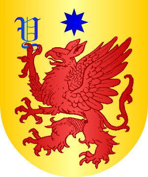 14.- En campo de sinople, una banda, de gules, engolada en dos dragantes de oro.