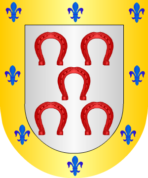de dos flores de lis de oro, puestos en faja. Bordura de azur, con ocho castillos