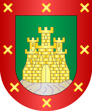 De Jerez de la Frontera (Cádiz). Armas De gules, un pino al natural sobre ondas de agua de plata y azur, acostado de dos leones de oro coronados de lo mismo, empinados al tronco. Bordura de plata con la leyenda "Virtute, nobilitate et armis" en letras de sable. |