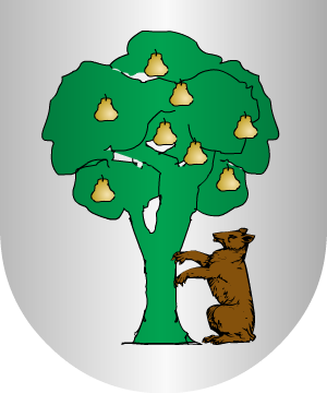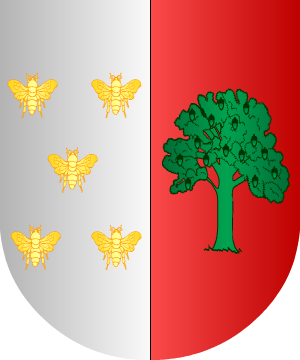 Partido, 1º de oro, un castillo de piedra; y 2º jaquelado de plata y gules.
